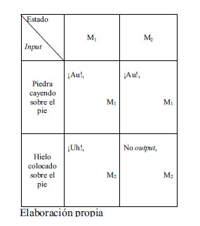 Demos una tabla de máquina mínima para lo mental. Está basada en Byrne (2011). Supongamos que podemos encontrarnos solo en dos estados, M1 y M2, recibir dos inputs, una piedra cayendo sobre el pie y un trozo de hielo colocado sobre el pie, y emitir dos outputs, las exclamaciones de "¡Au!" y "¡Uh!". Dadas estas condiciones, nuestra tabla de máquina es la siguiente: