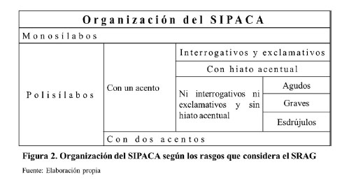 Las palabras agudas son el universo de la segunda norma, y así entran al SRAG. Lo mismo sucede con las palabras graves, que constituyen la totalidad de unidades de la tercera regla. También ingresan todas las esdrújulas y sobresdrújulas, pues conforman el total de expresiones de la cuarta regla, aunque estas últimas no son tomadas del SIPACA. Asimismo, el hiato acentual es otra propiedad relevante para la conformación de otra totalidad; o sea, toda palabra que lo presente ingresa al SRAG por tal condición, no por ser aguda o llana. Finalmente, existe una regla cuyo total de unidades son los adverbios terminados en -mente, que ingresan al SRAG por presentar dos acentos, pues para decidir su tilde se los descompone en dos constituyentes y se somete al primero a las reglas generales. A diferencia de lo que ocurre con los monosílabos, no hay en las normas una mención explícita a los polisílabos, pero la referencia a las agudas, llanas, etc., supone considerar su naturaleza polisilábica. Lo mismo se puede decir de las palabras con hiato acentual y de las unidades con dos acentos. Esto quiere decir que el SIPACA, según demandas del SRAG, está organizado en dos grandes grupos: i) monosílabos; y ii) polisílabos.