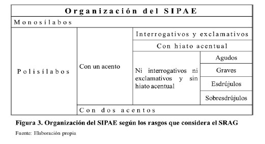 Si el ordenamiento del SRAG está determinado por la organización del SIPAE (que se organiza según el SIPACA), este debe dominarse plenamente antes que el SRAG. Nuestra propuesta sirve incluso para señalar la secuencia: la oposición polisílabo/monosílabo se aprenderá primero. Luego se debe saber distinguir entre polisílabos con un acento y polisílabos con dos acentos. Posteriormente, de entre los polisílabos con un acento se debe diferenciar entre tres grupos: i) interrogativos y exclamativos; ii) palabras con hiato acentual; iii) polisílabos no interrogativos ni exclamativos y sin hiato acentual. Finalmente, dentro de los polisílabos no interrogativos ni exclamativos y que no contengan hiato acentual, se debe realizar una distinción de las palabras por el lugar del acento (véase la figura 3).