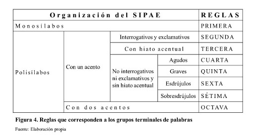 Si sabemos que cada grupo terminal le corresponde a una regla, entonces tendríamos las siguientes: primera, para todos los monosílabos; segunda, para los polisílabos interrogativos y exclamativos; tercera, para las palabras con hiato acentual; cuarta, para las agudas; quinta, para las graves; sexta, para las esdrújulas; séptima, para las sobresdrújulas; y octava, para los adverbios en -mente. La figura 4 ilustra lo dicho.
