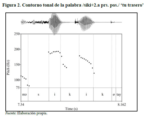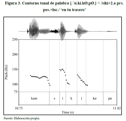 La medición del contorno tonal, por ejemplo, en una palabra de tres sílabas como [si.ki.kÆ] < /siki+2.a prs. pos./, como se puede apreciar en la figura 2 muestra el pico mayor en la vocal de la primera sílaba en relación con la segunda. El contorno tonal representado con líneas punteadas encima de las vocales delimitadas por líneas verticales no se presenta en la tercera vocal porque esta se encuentra completamente elidida.