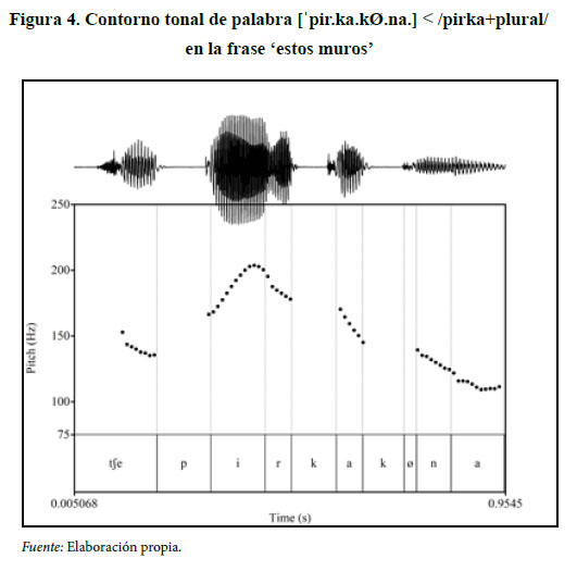 Otra palabra de cuatro sílabas como [ˈpir.ka.kÆ.na] < /pirka+plural/ en la frase ‘estos muros’ evidencia el contorno tonal alto en la primera sílaba de la palabra con un descenso en las demás sílabas posteriores a esta, como se observa en la figura 4. En dicho caso, se reporta la elisión de la vocal alta dorsal del sufijo de plural /-kuna/ > [-kna].