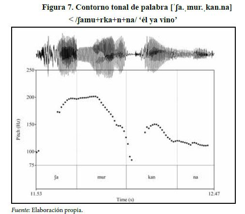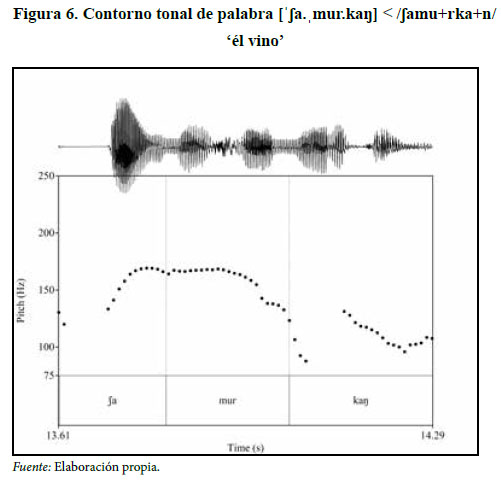 La presencia de este contorno tonal, que al parecer representa un acento secundario, se atestigua con mayor frecuencia en los verbos. En este caso, cuando la sílaba está constituida por una consonante en posición coda y no final de palabra, esta parece atraer un acento secundario y en algunas ocasiones hasta el acento primario. Como se muestra en la figura 6, la palabra [ˈʃa.ˌmur.kaŋ] < / ʃamu+rka+n/ ‘él vino’, con una configuración silábica <.cv.cvc.cvc.>, presenta un contorno tonal alto tanto en la primera sílaba [ʃa] como en la segunda [mur], y un contorno tonal bajo en [kaŋ]; sin embargo, el oscilograma registra que es la primera sílaba [ʃa] la que posee mayor energía acústica, por lo que nuestra interpretación asume a esta con el acento primario y a la segunda con el secundario.