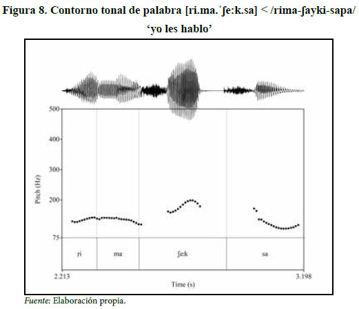 Este acento secundario en el verbo puede aparecer en algunos casos como acento principal, según se evidencia en la palabra [ri.ma.ˈʃe:k.sa] < /rima-ʃayki- sapa/ ‘yo les hablo’. En esta palabra, el acento principal recae en la penúltima sílaba, como se puede observar en la figura 8. Este comportamiento acentual se distancia con lo presentado hasta ahora para el quechua chachapoyano, pero se muestra totalmente plausible con lo atestiguado para las variedades quechuas de Ferreñafe y Huancapón.