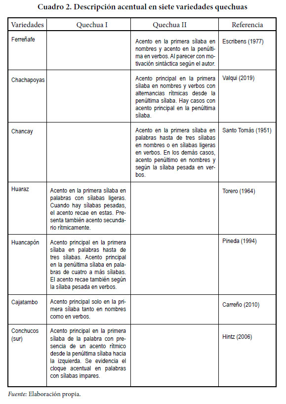 En resumen, como se puede apreciar en el cuadro 2 las variedades quechuas de Chachapoyas y Ferreñafe dentro del tronco Quechua II evidencian un patrón acentual por el cual el acento recaía en la primera sílaba en los nombres compuestos por tres sílabas o más (solo en sílabas ligeras tanto para nombres como para verbos en el quechua de Chancay, según los datos de fray Domingo de Santo Tomás). De igual manera, las variedades quechuas de Huancapón y Catajambo del tronco Quechua I muestran un patrón muy similar al descrito para Chachapoyas y Ferreñafe, con una alternancia que se hacía regular para la variedad de Huancapón en palabras de más de cuatro sílabas con acento primario penúltimo y acento secundario en la primera sílaba. Por otra parte, en la variedad quechua de Áncash, el patrón acentual en la primera sílaba se evidencia en palabras constituidas por sílabas ligeras, pero con el acento principal en la penúltima sílaba cuando se encontraba una sílaba pesada (CVC o CV:). Según los datos reportados por Hintz (2006) para el quechua del sur de Conchucos, el acento principal recae en la primera sílaba de la palabra con presencia de un acento rítmico desde la penúltima sílaba hacia la izquierda.