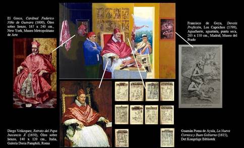 Figura 2 Elaboración propia a partir de las imágenes de Retrato del papa Inocencio X de Velásquez [sic], Devota profesión de Francisco de Goya, Cardenal Federico Niño de Guevara de El Greco, Nueva corónica y buen gobierno de Guamán Poma y El poder se nutre de dogmas (Velásquez [sic], Guamán Poma de Ayala, El Greco) de Braun-Vega.