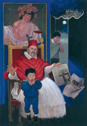Ese cuadro representa, en verdad, al papa Inocencio X, pintado por Velásquez [sic]. Y lo que lee es un periódico que comenta la pedofilia en la iglesia de los EE. UU. En el ángulo superior izquierdo hay un efebo -pintado por Caravaggio, artista homosexual protegido por los dignatarios del Vaticano, entre los que estaba el futuro Inocencio X. En la mano izquierda del papa hay un periódico que menciona los escándalos de pedofilia en los que se vio envuelto el Vaticano en el 2003. La sonrisa forzada y la mano derecha levantada simulan una defensa o una excusa gestual, ¿que acaso se refiere a la actitud hipócrita de la iglesia ante la sexualidad? En el umbral de la puerta, en el fondo, se ve a un joven que lanza su dedo acusador contra él/nosotros. Delante del papa, hay un niño mordiendo una manzana: ¿la próxima víctima? Es un ejemplo de las tres memorias. (Bauman, 2007, p. 102)