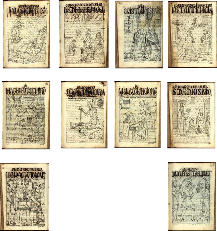 Detrás del retrato de Inocencio X, sobre el muro, hay diez imágenes del manuscrito de Nueva corónica y buen gobierno de Guamán Poma de Ayala (1615), realizadas en collage (figura 7). Felipe Guamán Poma de Ayala (1535-1615) nació en Lucanas, Ayacucho; se presume descendiente, por su padre, de los antiguos reyes Yarovilca, de Huánuco, y, por su madre, de Túpac Yupanqui, el décimo inca. Fue el escritor indio que escribió la más importante crónica como interpretación de su historia utilizando los conocimientos occidentales de la cultura europea, la literatura teológica y obras clásicas, que había adquirido a partir de la relación con el extirpador Cristóbal de Albornoz, con el que trabajó en 1570 como intérprete cuando este fuera visitador eclesiástico de Lucanas. Tal como lo señala el historiador Antonio Zapata (2008) en el libro Historia y cultura de Ayacucho: