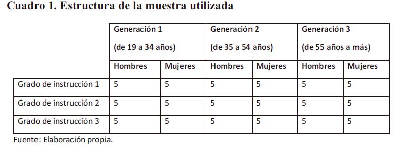 Las muestras se han estructurado por cuotas de afijación uniforme. Este proceso consiste en dividir el universo relativo en subgrupos, estratos o cuotas -atendiendo a unas variables sociales determinadas- y asignar igual número de informantes a cada una de esas cuotas (tomamos como referencia la metodología del proyecto para el estudio sociolingüístico del español de España y de América, PRESEEA, del año 20033). Las razones que nos llevaron a usar este sistema y no una muestra aleatoria o probabilística es que el trabajo por cuotas permite una comparación estadística más efectiva entre las cuotas internas de la misma y entre muestras diferentes. Además, estuvimos obligados a la búsqueda de informantes más allá de nuestros círculos que tienden a dejarse entrevistar fácilmente. Así, hemos considerado razonable crear las cuotas de la muestra a partir de tres variables sociales: el sexo, la edad y el grado de instrucción.