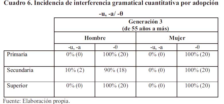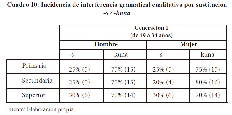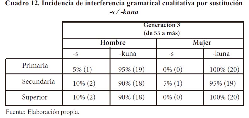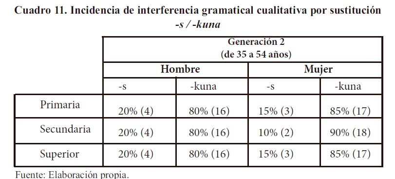 En la generación 2 (hablantes varones y mujeres de 35 a 54 años), la presencia del morfema de número -s disminuye un tanto, ya que su aparición alcanza en el nivel primario 20% en hombres y 15% en mujeres. En el nivel secundario, 20% y 10% en hombres y mujeres, respectivamente. Y en el nivel superior, 20 y 15%. Aquí se observa que tanto en hombres como en mujeres la incidencia del morfema quechua patrimonial se mantiene en la comunicación. Son las mujeres quienes, en diversos dominios sociolingüísticos, prefieren en mayor proporción la forma quechua -kuna.