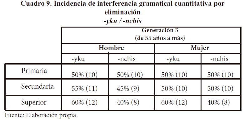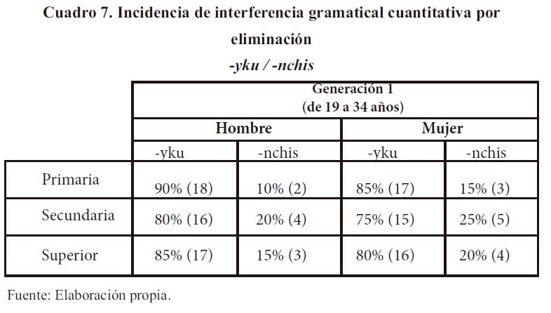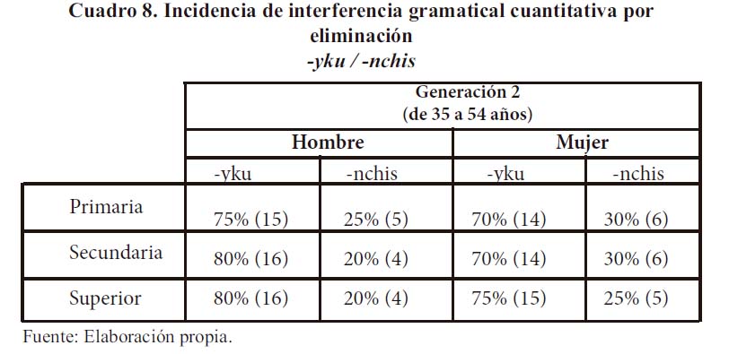 En el cuadro 7 observamos que 90% de hombres y 85% mujeres de la primera generación con estudios primarios utiliza -yku, y 85% de hablantes varones de la misma generación de nivel secundario y superior también prefieren en su interrelación el pronombre exclusivo. Las mujeres de nivel secundario y superior usan la forma exclusiva (75% y 80%, respectivamente). Debemos indicar que en esta generación, tanto en primaria, secundaria como en superior, las mujeres bilingües prefieren la forma inclusiva -nchis, en mayor proporción a los hombres.