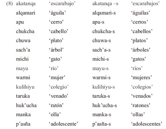 También tenemos en el quechua del valle del Colca la presencia del morfema numérico español -s al interior de oraciones nucleares: