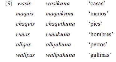El morfema numérico quechua -kuna viene siendo sustituido por el morfema flexivo de número -s de la lengua española. La forma ligada española se adiciona a los morfemas lexemáticos quechuas para formar nuevas palabras diferentes a las estructuras morfológicas del español y del quechua.