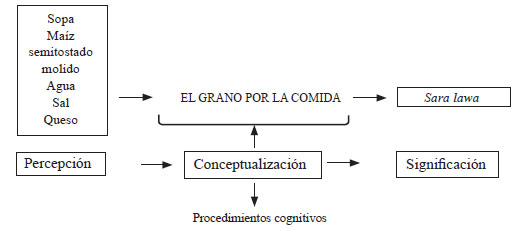 Los datos contenidos (3) son configurados conceptualmente de acuerdo con todo un procedimiento conceptual que se inicia con el marco perceptual, y que involucra la conceptualización y la conformación de la forma lingüística motivada. A continuación, presentamos el esquema para la forma sara lawa.