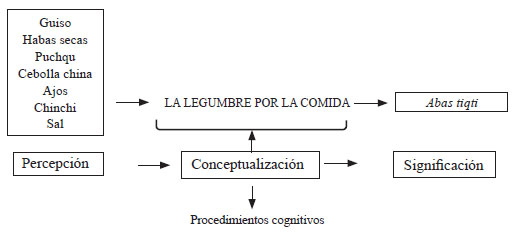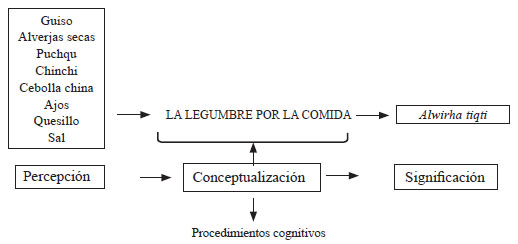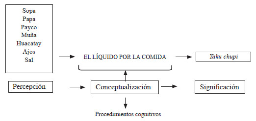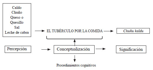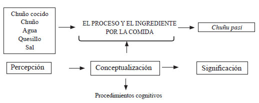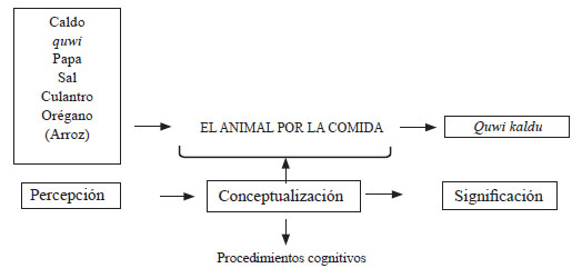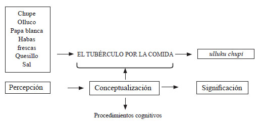El proceso de nominación de platos típicos en el quechua ocurre en tres fases definidas. Es decir, en la lengua y la cultura del quechuahablante, resulta medular la consideración de una etapa de percepción, luego una de conceptualización y, finalmente, una de significación (la materialización lingüística). El estadio denominado conceptualización es el que direcciona el proceso de nominación a través de recursos metonímicos.