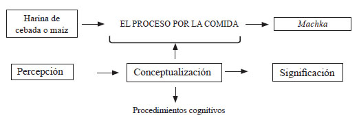 Los datos en (8) corroboran el mecanismo metonímico mediante el cual el producto final de un proceso de elaboración es el que define el nombre del plato típico. En el caso de sanku (8b), se trata de un alimento dulce que se elabora con la machka. Se disuelve en una olla la harina de maíz o cebada en agua fría; luego, se pone a fuego lento con azúcar y se añade hojas de anís o manzanilla; asimismo, se le agrega manteca de chancho y se va removiendo hasta que el preparado esté bastante denso, como un budín. En la figura siguiente, se propone el mecanismo conceptual metonímico en particular (Figura 12).
