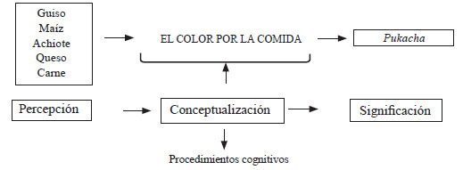 Es posible detectar que la percepción cromática motiva la configuración de metonimias, en las cuales es el color el que determina el nombre del plato tradicional en quechua. Así, el vocablo pukacha (de puka 'rojo' y -cha 'diminutivo') o rojito, refiere a un picante de harina de maíz blanco con achiote que se prepara adicionalmente con queso y carne. Este nombre proviene de su color rojo característico, el cual se explicita como elemento predominante y categoriza conceptualmente al plato típico. En la figura siguiente, se propone el mecanismo metonímico de este nombre de comida (Figura 14):