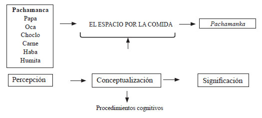 El dominio referido al espacio puede motivar la conceptualización metonímica y producir nombres de comidas. Tal es el caso de la palabra pachamanka (de pacha 'tierra' y manka 'olla'), la cual conecta tanto el mecanismo metafórico como el metonímico. En cuanto a la metáfora, se precisa cavar un hoyo en la tierra y este es categorizado como una olla. A su vez, es el lugar en el cual se prepara este plato típico el que motiva la nominación de la comida, pues en este hoyo se colocan productos como el choclo, la papa, las habas, la oca, el queso, y todo tipo de carnes que previamente son aderezadas con hierbas aromáticas como el chinchi o pachachinchi. Los ingredientes se disponen a través de diversas capas de piedras calientes que sirven para efectos de la cocción. En tal sentido, la entidad espacial pachamanka es el dominio resaltado o el camino de acceso hacia el ámbito de la comida.
