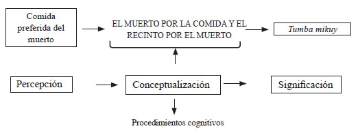 En efecto, el simbolismo que entraña esta metonimia conceptual involucra un proceso que supera la simple preparación de una comida, pues la ocurrencia de este evento desencadena una serie de efectos con valor cultural para el hombre andino. En cuanto a la explicitación de la cadena metonímica, la última morada del difunto -a saber, la tumba-, es conceptualizada en reemplazo del muerto. Además, el propio fallecido aparece de forma prominente en el nombre a través del lugar y, en consecuencia, se le considera metonímicamente más relevante que la propia comida (Figura 16).
