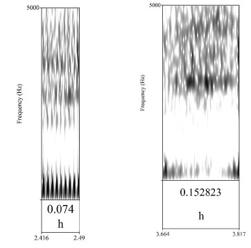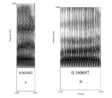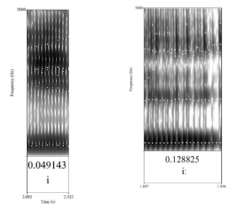 En las imágenes anteriores (Figura 1 y Figura 2) notamos duraciones diferentes para las vocales cortas: 0,063 milisegundos para la vocal central baja abierta no redondeada [a] y 0,049 milisegundos en el caso de la vocal alta anterior [i]. Sus correspondientes correlatos con mayor duración son la vocal central baja larga [aː], cuya duración es de 0,160 milisegundos, y la vocal alta anterior larga [iː], de 0,128 milisegundos. La duración, en rigor, es el correlato usado para configurar fonológicamente sonidos con mayor o menor extensión en la realidad.