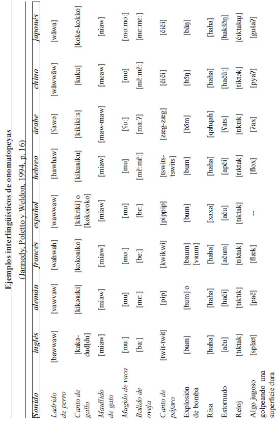 Notamos que existen coincidencias consistentes en las lenguas recopiladas por los autores, sobre todo en correlatos de la realidad que no implican una complejidad del ruido que se categoriza fonológicamente y cuya réplica fonética se explicita. Por esa razón, Moreno Cabrera, siguiendo a Voronin (2005), asume el concepto de onomátopo. Los onomátopos son "... raíces con un significado icónico que dan lugar a diversas onomatopeyas en diversas lenguas" (Moreno Cabrera, 2016, p. 136). Los onomátopos están motivados, de forma que dista de la arbitrariedad clásica que se le confiere al signo lingüístico. Un caso concreto de onomátopo es la forma pi o pip, para referirse al sonido del pito o al sonido de los pájaros. Esta estructura es reconocible interlingüísticamente y es robusta por su regularidad y por incluir los mismos sonidos.
