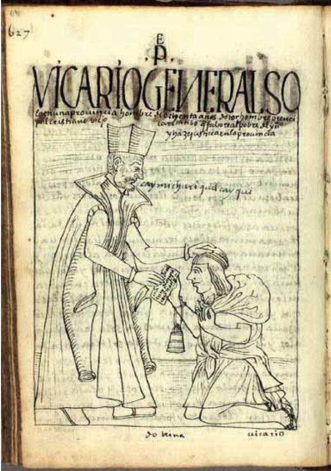 En el dibujo de la página 641 de la Nueva corónica, se hace evidente la confluencia de distintos niveles de significado visual y escrito según los cuales varios códigos de comunicación se activan. Este dibujo forma parte de un capítulo sobre el clero y muestra a un vicario español tocando la cabeza de un indio del pueblo que se arrodilla ante él. El humilde indio lleva un fardo grande a sus espaldas y viste sencillamente con una camisa-túnica de tela basta y sandalias. El vicario lleva prendas que lo revelan como miembro del clero: una capa elaborada y un tocado distintivo. De esta manera, se establecen visualmente las jerarquías del poder a través de los códigos de la vestimenta y el lenguaje corporal. Además, Guaman Poma refuerza la información dibujada con el texto escrito. En la parte superior de la ilustración se nombra al vicario y se alaban sus acciones caritativas que protegen a los indios de la provincia.