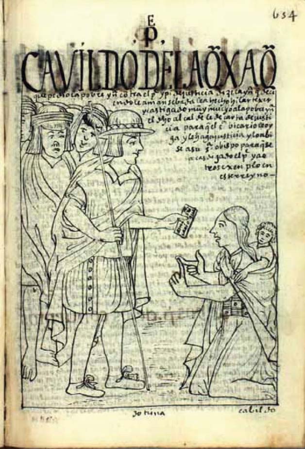 Previamente había citado el dibujo del vicario que defendía a un indígena por medio de un amparo. En otro ejemplo pictográfico-textual seguimos otro litigio paso a paso: en él, un líder del cabildo indígena entrega una carta a otro personaje (Figura 2). En este caso, el oficial indígena le da la misiva a una mujer solicitante que lleva a su hijo en sus espaldas y se arrodilla frente a él. Por medio de dicha carta escrita por este alcalde y miembro del cabildo, la persecución sacerdotal hacia esta mujer terminará pronto. La carta, que se muestra inclinada para que el lector pueda leer el texto, lleva una inscripción dirigida al cacique de su comunidad: “a mi señor cacique”. El título de esta página es didáctico porque indica las etapas posibles del recurso legal: nos informa que el cacique enviará esta queja al vicario quien, a su vez, la reenviará al obispo y finalmente se hará justicia contra el sacerdote abusivo.