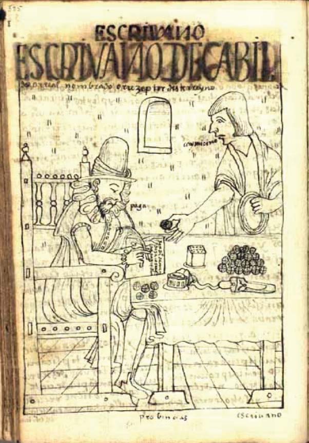 El tema del papel y la moneda aparecen también en la página 525 (Figura 4) en la cual un escribano español escribe una petición frente a un indio de la comunidad: