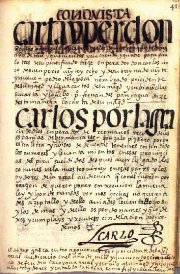 Sin embargo, Guaman Poma omite frases de la carta original transcrita por Zárate como “para el buen gouierno dessas partes y buen tratamiento de los naturales” que está incluida en la carta original hecha por el rey, fechada de 1554 (Zárate, 1955 [1555], p. 307). Esta omisión va de la mano con la inserción de un texto que no estaba en la misiva de Carlos V. En esta, Guaman Poma escribe atrevidamente un perdón real para Gonzalo Pizarro y los otros rebeldes: “Y de ello os perdonamos” (p. 420). Guaman Poma termina la transcripción de la carta real con una firma del monarca de tamaño considerable, prueba de la bondad de este monarca en los días iniciales de la sublevación.