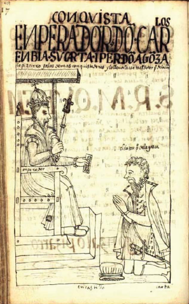 Los personajes destacados en esta ilustración son el rey Carlos V, sentado en su trono, y Pedro de La Gasca, emisario humilde arrodillado a sus pies. Sin embargo, el elemento semiótico dominante aquí es la carta que el rey extiende a La Gasca. Se ve claramente en su inscripción que el destinatario de este papel es Gonzalo Pizarro. Su nombre se destaca en el cuadro del documento y se ha escrito con tanto esmero que ni el pulgar del monarca puede ocultarlo. El título de este dibujo elimina cualquier duda respecto a su contenido: “Enperador Don Carlos enbía su carta i perdón a Gonzalo Pizarro y a los demás conquistadores” (Figura 6). Por lo visto, esta epístola tenía tanta importancia que Guaman Poma provee una ilustración del acto mismo de entrega del perdón de la mano del rey a la de La Gasca, quien la recibe. La carta de perdón entonces forma parte integral del texto, aunque seguramente Guaman Poma reconoce las acciones tiranas y traidoras del rebelde.