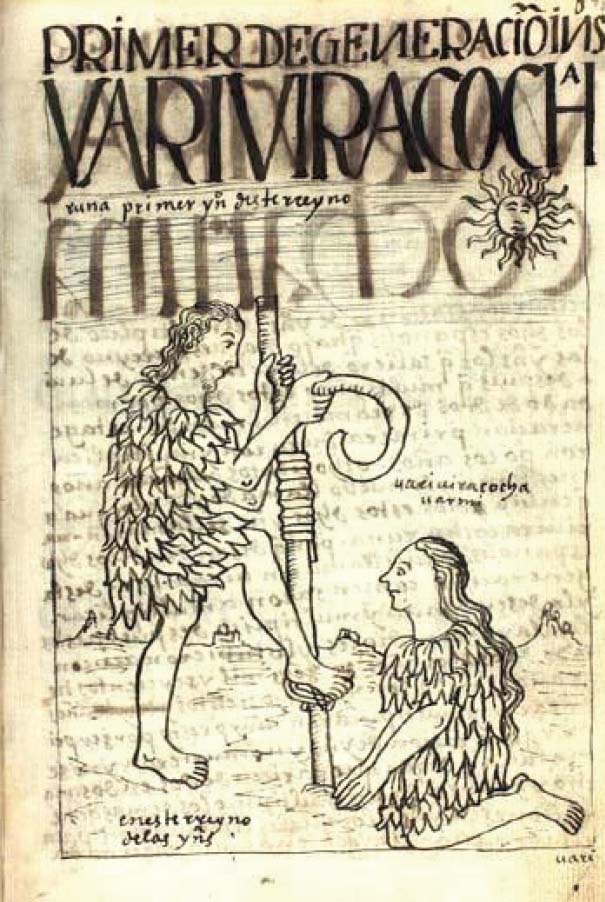 Existe, afortunadamente, un texto contemporáneo a la Nueva corónica que reúne una serie de narraciones sobre los dioses tutelares de los diversos grupos étnicos que habitaban la región de Huarochirí y cuyos relatos fueron recogidos justamente como parte de una campaña de extirpación de idolatrías. En el documento escrito en quechua pastoral conocido como el Manuscrito de Huarochirí (ca. 1598-1608), el narrador anónimo incluye detallados relatos sobre los dioses Pariacaca, Huallalo Caruincho, Pachacamac, entre otros, así como la relación de estos huacas con espacios geográficos específicos y con los hombres. En esas historias se explica, por ejemplo, que Huallalo Caruincho (que en el texto de Guaman Poma aparece como Carhuancho Uallallo) creó aves de varios tipos que poseían plumas de deslumbrantes colores amarillo y rojo. Pero tras ser derrotado por Pariacaca, Huallalo fue expulsado junto a sus creaciones a la región de los Antisuyos (en Taylor, 2008, p. 23). Dado que las plumas amarillas y rojas son parte del relato mítico de la derrota de Huallallo, no sería sorprendente que esas plumas pudieran tener significaciones muy diferentes para los adoradores de uno y de otro huaca. Más allá de esta hipótesis, en el Manuscrito de Huarochirí hay relatos en los que explícitamente se observa cómo algunos huacas ordenan el tipo de objetos que se deben emplear como ofrendas sagradas. Pero, más importante aún para el propósito de este ensayo, ese texto explica el proceso por el cual un dios o huaca podía transformarse en piedra.