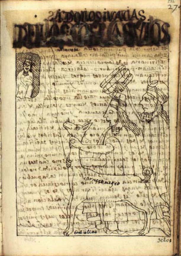 En este mismo capítulo sobre los ídolos, se halla el dibujo de la página 272 titulado “ÍDOLOS I VACAS DE LOS COLLA SVIOS / Uillca Nota / carnero negro / en el Collao // waqa /” (Figura 2) y su correspondiente texto escrito en la página 273. Tanto la imagen icónica como la narrativa textual guamanpomianas se valen de elementos demonológicos para censurar el empleo ritual de la coca. En este dibujo, se ven dos hechiceros ofreciéndole dones a una divinidad ubicada en una montaña. Ambas personas llevan túnicas extensas, pelo largo y lacio sujeto por un sombrero ceñido por una media luna y collares con dijes redondeados. El hechicero de la izquierda sostiene por el cuello un carnero negro, típica ofrenda sacrificial al demonio en la teología cristiana: