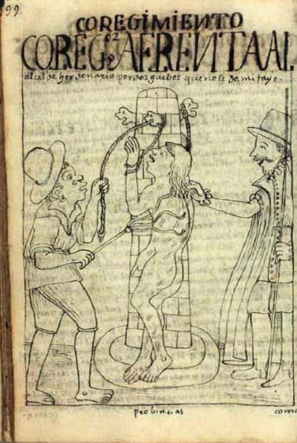 Cuelga de los pies al cacique prencipal y a los demás le asota sobre encima de un carnero y a los demás le ata desnudo en cueros en el rrollo y lo castiga y trisquila. Y a los demás le tiene en la cárzel pública preso en el sepo con grillos cin dalle de comer ni agua [...] se an muerto afrentados y no ay rremedio (p. 530).