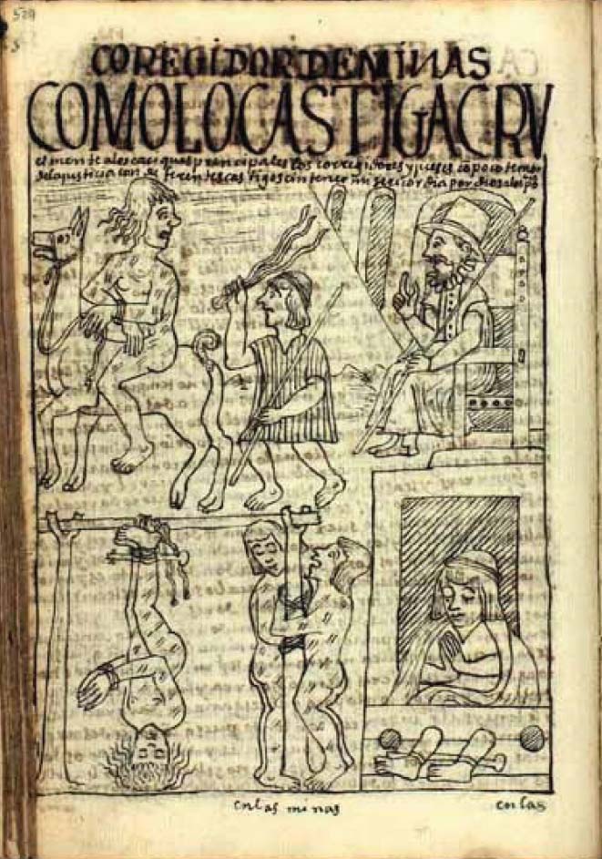 Un caso extremo y singular de este sistema de dominación colonial es la figura del minero denominado en un dibujo sobre el “corregidor de minas”. Asociado al poder económico, el corregidor de minas empleaba una gran fuerza laboral indígena en condiciones extremas de explotación. Los tormentos de los mineros contra los indios son descritos así: