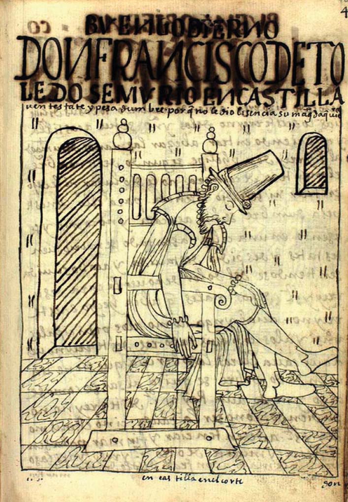 En muchos dibujos, las figuras de poder (corregidores, encomenderos, mineros, curas u otras) están sentadas en una silla (idéntica gráficamente a la de Toledo), pero su poder se establece figurativamente con su posición erguida y la firmeza con que están puestos sus pies sobre la tierra. En el caso del virrey en desgracia, su cabeza y su columna aparecen inclinadas; se trata de un cuerpo doblegado, pero además sus piernas no poseen ya firmeza y cuelgan, como las de los ahorcados en otros dibujos, de forma disonante sobre el enlozado. De este modo, el autor “castiga” narrativa y figurativamente al virrey Toledo, la figura arquetípica de la autoridad soberbiosa en la crónica de Guaman Poma.