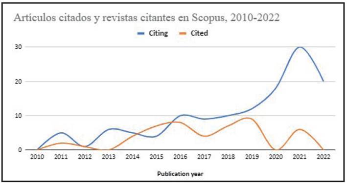 El ingreso a las bases de datos de WoS (ESCI) y Scopus también ha favorecido el diálogo entre Letras (Lima) y otras revistas académicas. De hecho, desde el ingreso en el año 2017 en WoS, se puede apreciar un crecimiento constante en el número de artículos citados de la revista Letras (Lima) (Figura 3). Así, pasamos de nueve citaciones en el año 2017 a treinta al año 2021. En 2022, sin haber cerrado las publicaciones de fin de año, ya han sido citados veinte artículos de la revista Letras (Lima). Estas bases de datos han favorecido a los autores y las autoras que han publicado en Letras (Lima), en tanto sus trabajos son más visibles para investigadores de todo el mundo que se apoyan en dichas bases de datos para sus investigaciones. El número de revistas citantes es menor, pero el crecimiento de este indicador suele tomar más tiempo y dependerá del mismo crecimiento de la revista en estos próximos números.