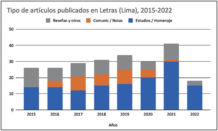 Este índice bibliográfico también permite observar cuáles fueron los intereses académicos y los temas que cambiaron conforme la revista Letras trazó con mayor precisión sus líneas editoriales. En algún momento de su tiraje, Letras publicaba poemas, cuentos; también difundió trabajos de corte etnográfico, arqueológico e historiográfico; del mismo modo, cubrió las actividades académicas, sean escuelas de verano, conferencias, nombramientos de nuevas y nuevos profesores de San Marcos, así como necrologías. Conforme fueron apareciendo otros espacios de divulgación -como la Revista del Instituto Seminario de Historia Rural Andina, fundada en 1966 por Pablo Macera- la actividad editorial de Letras fue especializándose y delimitándose hacia las actuales líneas editoriales. Como tal, hoy en día se publican trabajos en literatura y teoría literaria; lenguaje y lingüística; historia del arte; artes y humanidades en general.